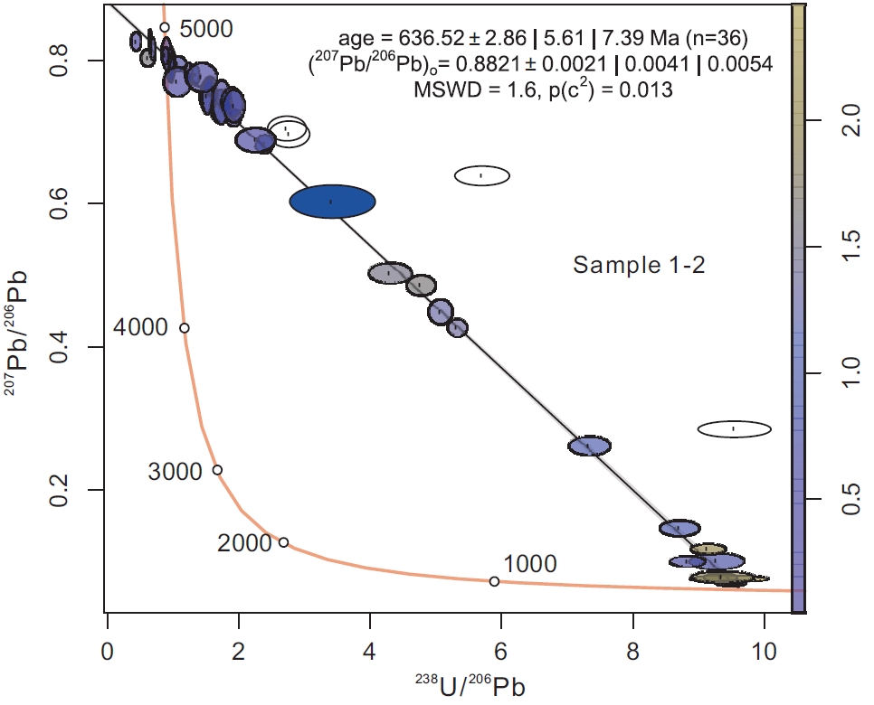 通过对方解石进行U-Pb定年,在Tera-Wasserburg图解中得到了一个636.5 ± 7.4 Ma 下交点年龄(图4)。传递衰变常数和标样误差之后,年龄误差为17.8 Ma。因此,采样层位的沉积时代为636.5 ± 7.4/17.8 Ma。该年龄和前人从盖帽白云岩内白云石中测得的U-Pb年龄629.3 ± 16.7/22.9 Ma以及火山灰锆石U-Pb年龄635.23 ± 0.57 Ma在误差范围内相一致。新的年龄数据表明方解石在埃迪卡拉纪早期形成,不可能在埃迪卡拉纪晚期或者寒武纪热液活动中形成。