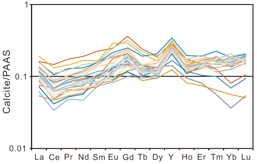 方解石REE组成总体上表现出La,Y和Gd正异常(δGd=1.1-1.96),高Y/Ho比值(大多数>44)(图5)。Eu 以正异常为主(δEu=1.02-1.38),少量表现出负异常(δEu=0.79-0.96)。高Y/Ho比值为海水沉积的特征,Eu 正异常说明有热液活动的影响。从REE配分型式上可以看出有些方解石可能是从海水中形成的。这种情况下,甲烷的厌氧氧化(AOM)形成了方解石,黄铁矿,硫酸钡和铁氧化物以及盖帽白云岩中的负δ13Ccarb值。负δ13Ccarb方解石和盖帽白云岩近于同期形成,甲烷水合物去稳导致甲烷泄露到大气中,引发冰川融化。有些方解石可能是在埃迪卡拉纪早期(ca. 632 Ma)热液活动中形成的。