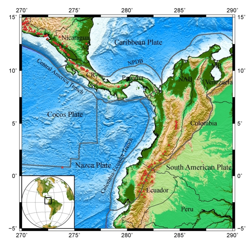 中南美洲西北部是纳斯卡板块、科科斯板块与南美板块和加勒比板块交汇碰撞的地区,具有复杂的板块构造和频繁的火山地震活动,是研究板块碰撞及俯冲动力学过程的关键区域(图1)。然而,受数据或方法的限制,前人成像研究的精度和分辨能力不足以准确回答一些重要的科学问题。例如,巴拿马火山间隙与科科斯板块东向俯冲以及加勒比板块南向俯冲之间存在怎样的关系?尼加拉瓜弧后火山下方的地幔结构是怎样的?卡尔达斯构造带南北两侧的速度和各向异性结构是否存在差异?这些科学问题都需要更精细的成像研究来进一步解决。