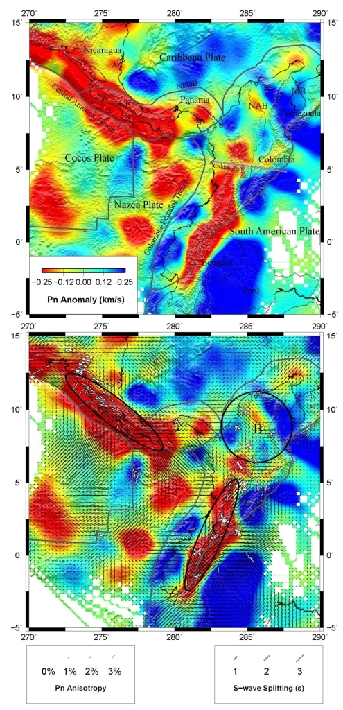 图2 中南美洲西北部地区地幔顶部Pn波速度与各向异性结构
