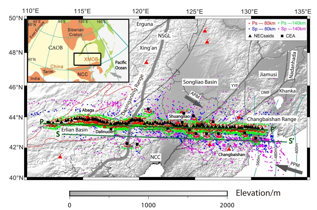 图1 兴蒙造山带构造划分、本研究使用的地震台站分布及接收函数Ps 和Sp穿透点位置分布图。左上角插图为大区域构造简图;PPM—太平洋板块的绝对运动方向;APM—欧亚板块的绝对运动方向;NSGL—南北重力梯度带;YYF—依兰-伊通断裂;DMF—敦化-密山断裂;NCC—华北克拉通