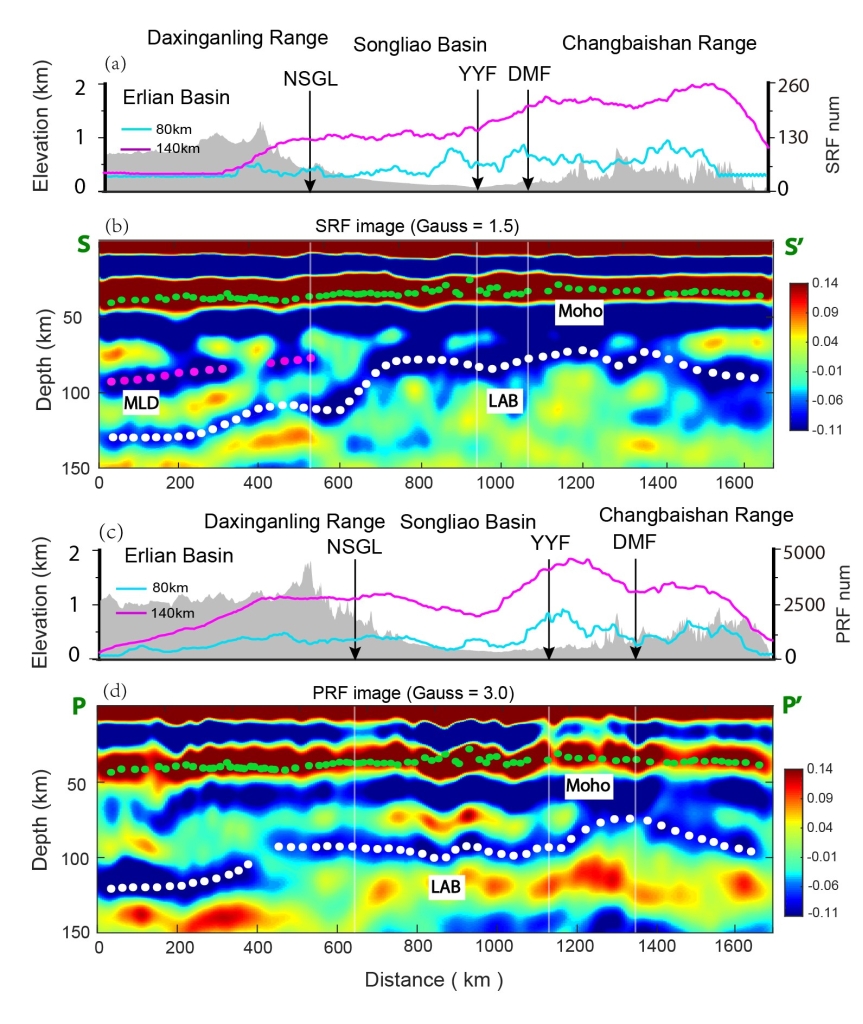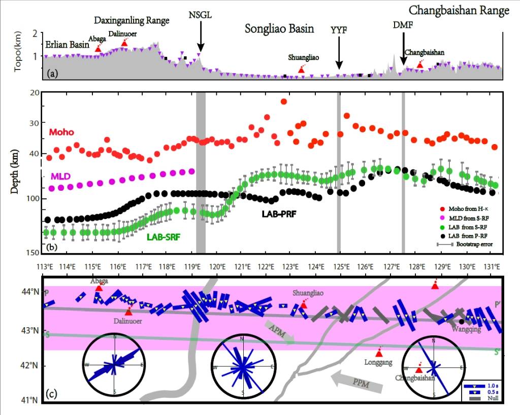 为深入了解兴蒙造山带的构造演化和岩石圈变形特征,800彩票地球与行星物理院重点实验室博士生贺杨与导师陈棋福研究员、陈凌研究员等,基于兴蒙造山带南部宽频带流动地震台阵(吉林珲春-内蒙二连浩特剖面,全长约2000 km)和区域固定台网的地震波形数据,采用S波和P波接收函数波动方程叠后偏移成像方法对岩石圈界面进行成像研究(图2)。S波和P波接收函数成像结果均表明兴蒙造山带的岩石圈结构存在明显的非均匀性,研究区的地壳和岩石圈整体呈现出“中间薄两边厚”的趋势:即西部的大兴安岭和二连盆地下方地壳及岩石圈最厚,分别可以达到30-42 km和100-130 km;东部的长白山山区次之,地壳及岩石圈厚度分别为30-35 km和80-110 km;中部的松辽盆地地壳及岩石圈最薄,约为23-34 km和75-90 km。此外,地壳及岩石圈厚度在郯庐断裂带附近存在明显变化,表明郯庐断裂带可能是深部热物质上涌或迁移的主要通道。S波接收函数偏移图像(图2b)显示,在南北重力梯度带以西约75-100 km深度处出现另一组清晰、稳定的负信号,可能代表岩石圈地幔内部界面MLD(即中岩石圈不连续面),这一界面与南北重力梯度带以东的岩石圈-软流圈界面LAB大致位于同一深度。通过综合分析和区域对比推测,MLD观测反映现今南北重力梯度带以西的岩石圈地幔内部存在一个(相对)力学薄弱层,早期可能也存在于南北重力梯度带以东区域,并在古太平洋和现今太平洋板块俯冲的改造作用下导致岩石圈减薄至现今的厚度。