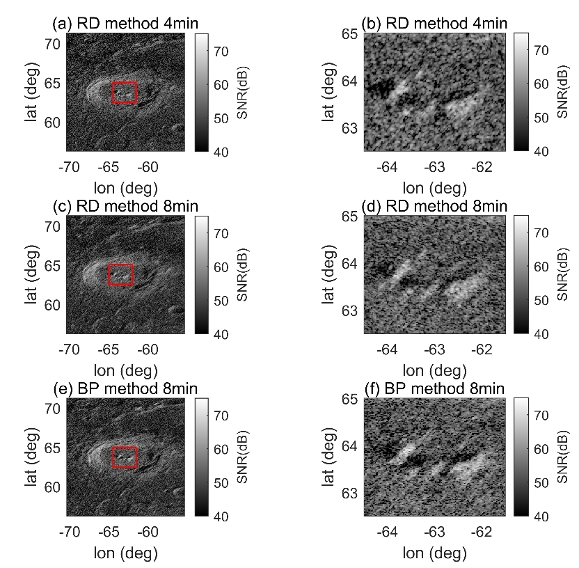 图2 左列是毕达哥拉斯撞击坑区域成像图,右列是左列红色矩形框区域的放大图。(a、b)距离多普勒算法成像图,相干积累时间4分钟;(c、d)距离多普勒算法成像图,相干积累时间8分钟;(e、f)后向投影算法成像图,相干积累时间8分钟