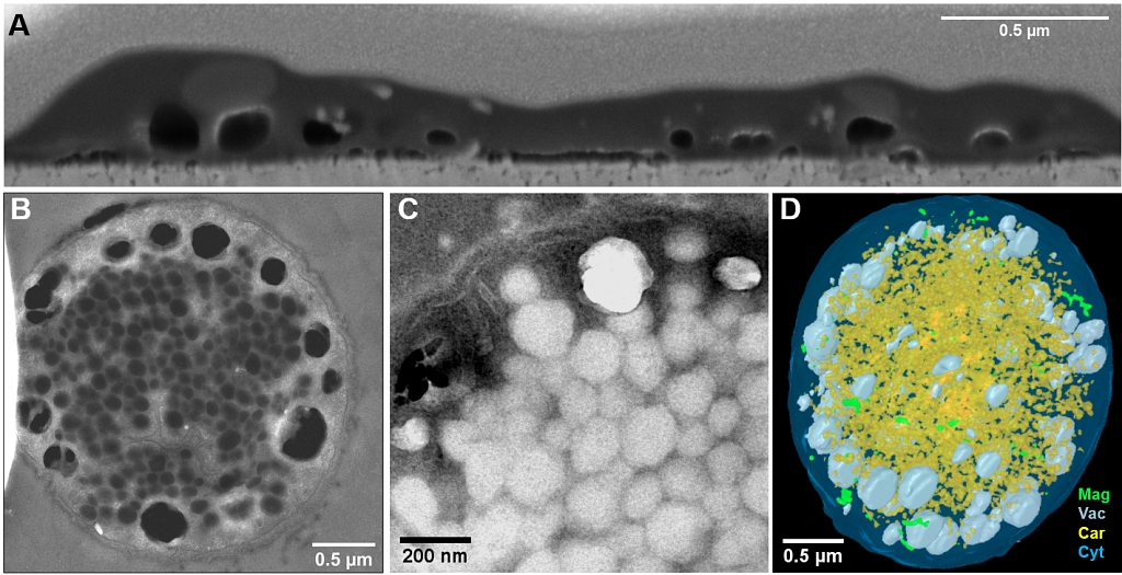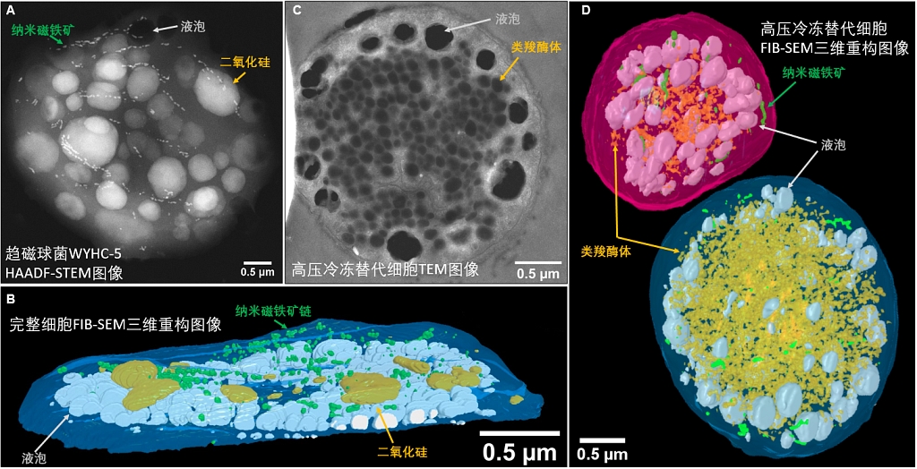 (D)一个完整的WYHC-5细胞(高压冷冻替代处理后)的聚焦离子束-扫描电镜三维重构图像。高压冷冻替代预处理有利于呈现细胞内液泡、磁小体膜和类羧酶体的精细结构,但会造成二氧化硅和单质硫颗粒的溶解