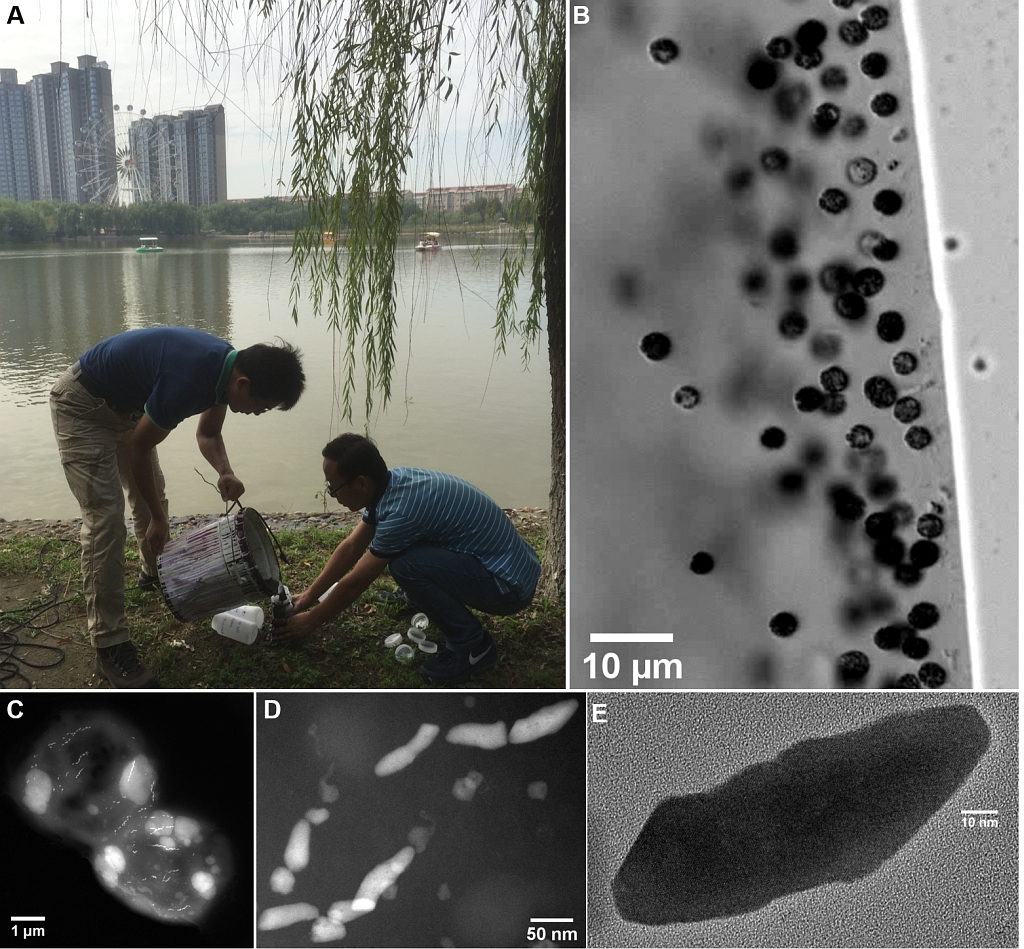 图1 陕西西安未央湖沉积物采样和趋磁球菌WYHC-5的实验室发现。