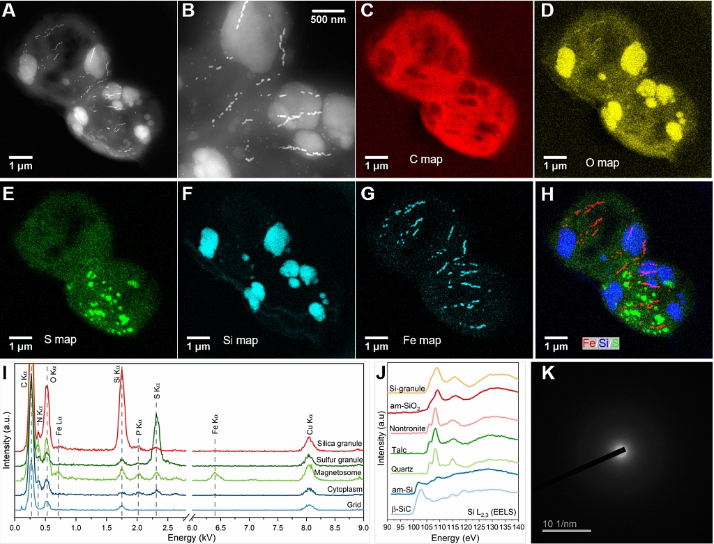 (A)高角环形暗场扫描透射电子显微镜图像展示WYHC-5在细胞内合成纳米尺寸的磁铁矿链和亚微米尺度的二氧化硅球状颗粒;