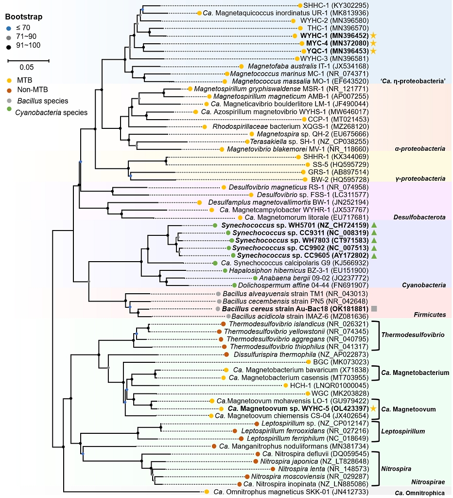 图4 具有生物沉硅能力的原核生物的系统发育树。黄色五角星代表能在细胞内矿化合成二氧化硅颗粒的趋磁细菌,绿色三角和灰色方框分别代表具有生物沉硅能力的聚球藻属蓝细菌和枯草芽孢杆菌