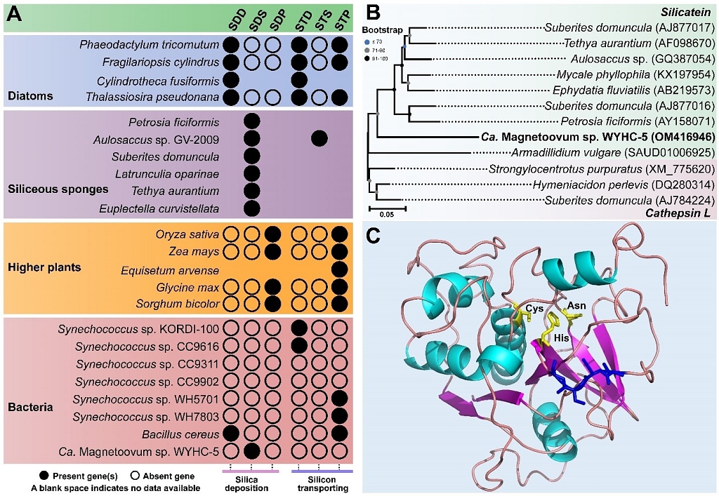 趋磁细菌是一类能在细胞内合成纳米磁性晶体颗粒(也被称为磁小体,化学成分为Fe3O4或Fe3S4)的原核生物。磁小体多呈链状排列,作为细胞的小磁针,可以感知地磁场,使其沿磁力线方向游泳,在水体中“有氧-缺氧过渡带”上下穿梭,从而迅速找到最适合生存的微环境。问题是,除了磁小体,趋磁细菌为什么还要在细胞内沉积大量的二氧化硅?其分子机制是什么?这种在一个细胞内合成多种矿物的生理学和生态学意义是什么?为了弄清上述问题,研究团队对WYHC-5细胞进行了基因组测序分析,并与其它硅代谢相关生物的基因组开展的生物信息学比较分析。结果如下: