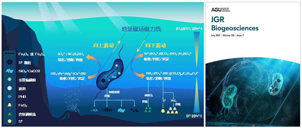 图6 (左)趋磁细菌利用地磁场的导向作用驱动地球水生环境中有氧-缺氧过渡带元素生物地球化学循环工作模型;(右)结合中国太极文化理念,为美国地球物理学会期刊JGR封面艺术化的工作模型图(Li et al., JGR, 2020; Li et al., JGR, 2021)