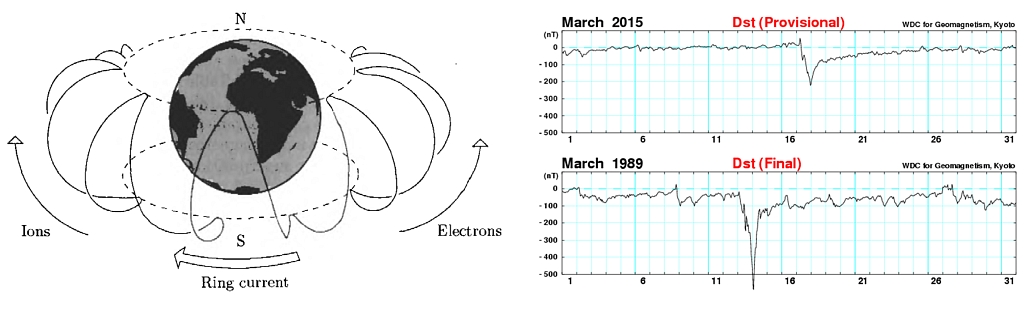 图1 (左)地球磁层西向环电流形成示意图;(右)增强的西向环电流引起地球空间磁暴,造成地表地磁场强度下降