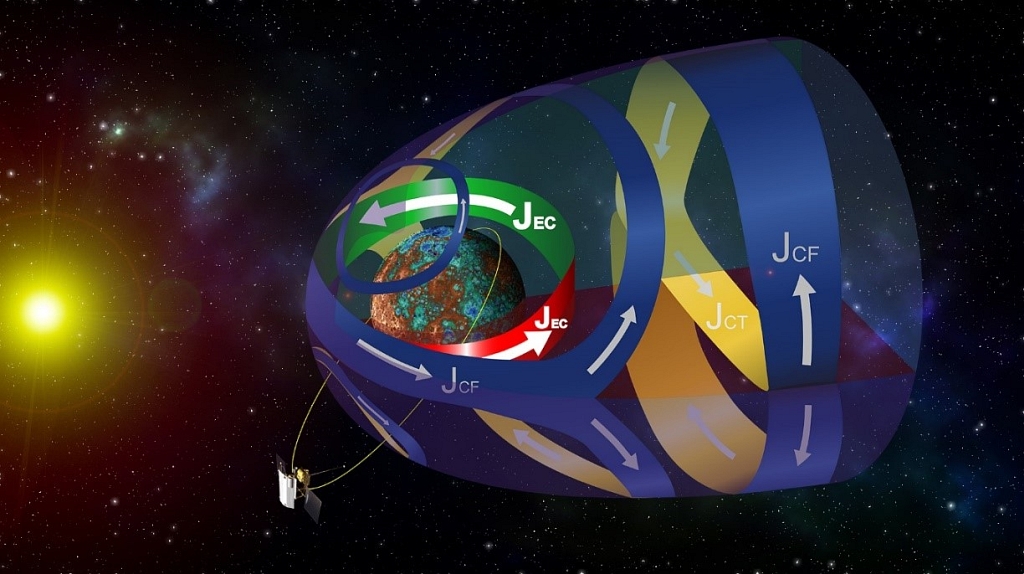 通过对信使号近4年的磁场统计分析,他们的研究显示水星磁层内部并不存在类似于地球磁层的西向电流环带;然而却惊人地发现在水星夜侧磁赤道附近,~500-1000 km高度范围内存在一个明显的东向电流(JEC,图2)。该东向电流主要集中在磁赤道面上,自西向东运转,并与向阳面的磁层顶电流(JCF)闭合形成回路。进一步的模拟研究不仅证实了他们的分析结论,而且还显示出该东向电流能永久性地存在于任意太阳风条件下。