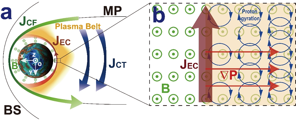 结合模拟及相关分析计算,他们提出了东向电流的形成机理(图3):太阳风离子通过扩散作用从磁层两侧进入水星磁层,在磁场的引导作用下,在夜侧磁赤道面附近形成准捕获等离子体带;在等离子体带的内侧,径向向外的等离子体压力梯度与磁场共同驱动了东向抗磁电流。