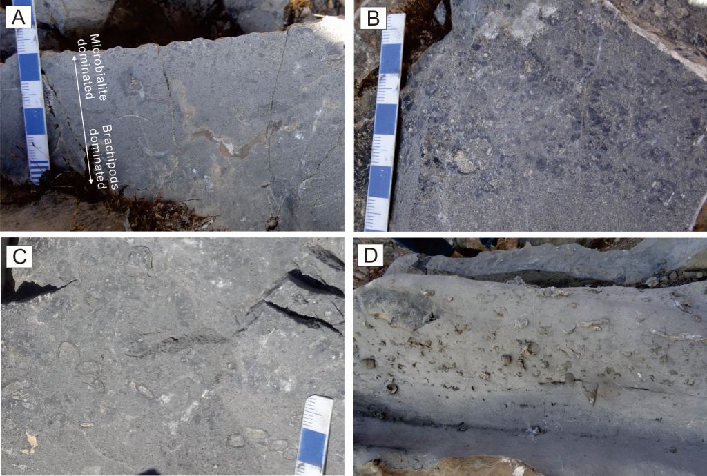 1 乌科剖面LOME相关层位生物演化的记录。(A)上奥陶统铁足菲克组顶部记录了从富含Hirnantia? sp.Triplesia sp.腕足动物碎片逐渐向上过渡到微生物凝块岩层的现象;(B)和(C)赫南特阶中出现典型的微生物岩(凝块石、核形石);(D)铁足菲克组顶部出现的暖水型四射珊瑚Lambeophyllum(略高于微生物岩层或侧向过渡)