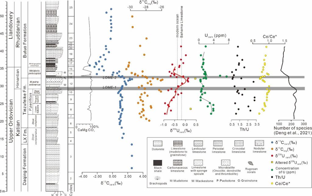 近年来的研究发现,奥陶纪末生命大绝灭可划分为两幕,并分别受控于不同的灭绝机制:第一幕灭绝(LOME-1)发生在凯迪期(Katian)和赫南特期(Hirnantian)之交,彼时气候迅速变冷,冈瓦纳大陆冰川快速扩张至低纬度地区,海平面快速下降,并最终导致大规模生物绝灭;第二幕灭绝(LOME-2)发生在赫南特期中晚期,此时随着气候快速回暖,大陆冰川快速消融,冰川融水携带大量大陆风化营养物质进入海洋,促使初级生产力飙升,并进一步导致浅海区耗氧量增加,缺氧程度加剧,再次重创刚刚适应冷水环境的海洋“机会主义者”(以赫南特动物群为代表的)。然而,过去绝大多数对LOME的研究主要着眼于陆棚-斜坡区富有机质沉积的古海洋环境变化,缺少对全球海洋氧化还原环境变化的约束。因此,LOME时期全球整体海洋氧化还原特征变化的特征、重要时间节点及与生命兴衰的联系仍不明确。