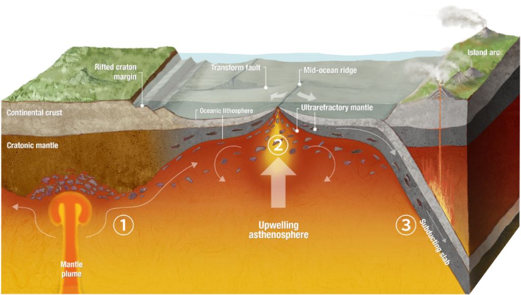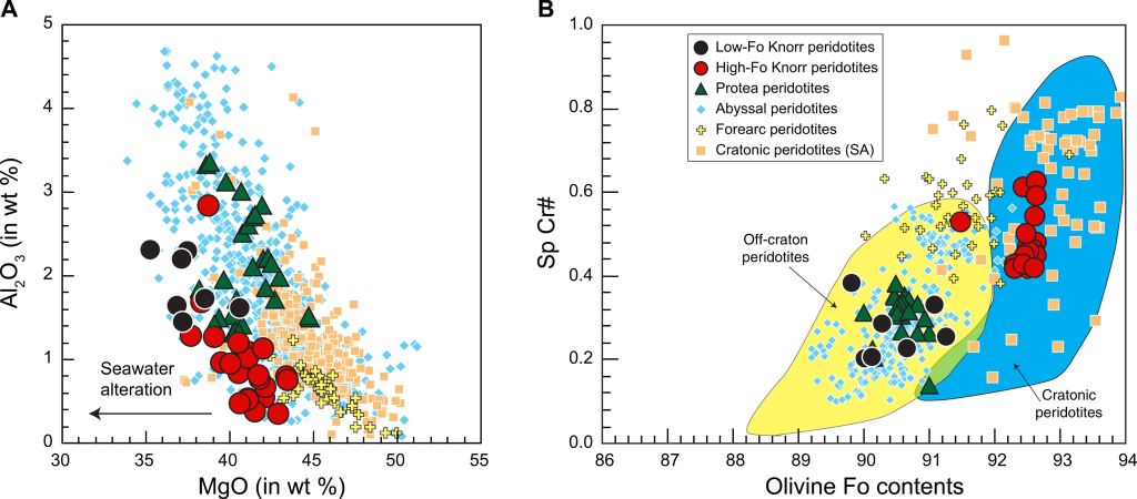 尽管克拉通地幔减薄可能存在不同的方式,已提出的机制包括地幔拆沉、地幔柱热/化学侵蚀等,但减薄的太古宙克拉通地幔通常被默认进入到软流圈中。考虑软流圈可以在全球范围内发生地幔对流,并且在洋中脊发生被动上涌和减压熔融,从而形成新的大洋岩石圈。因此,现今洋中脊的深海橄榄岩作为软流圈部分熔融后的残留体,是寻找软流圈中的太古宙克拉通地幔的最佳载体。