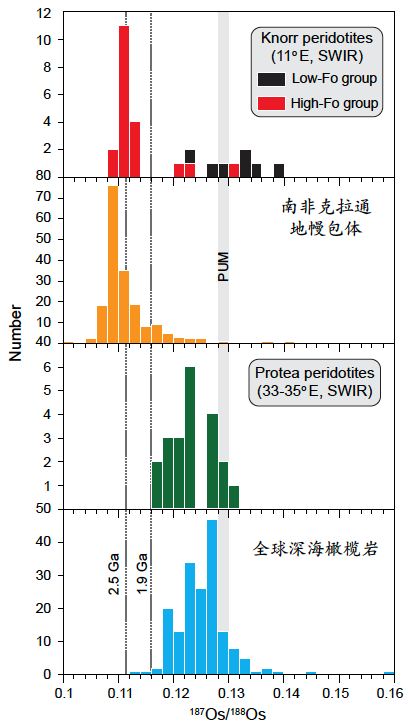 3 西南印度洋深海橄榄岩187Os/188Os频率直方图及与全球深海橄榄岩、南非克拉通地幔包体的对比