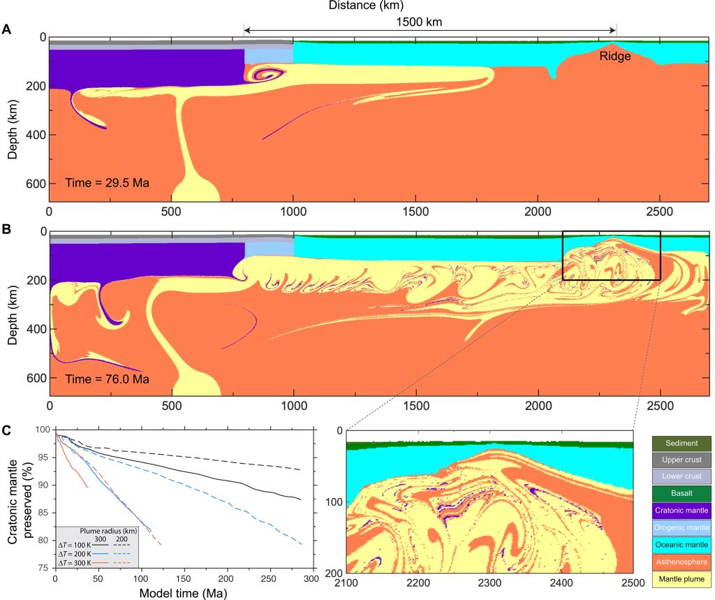 4 太古宙克拉通地幔再循环的数值模拟。(A, B)地幔柱活动启动后29.5 Ma76 Ma的模拟结果;(C)地幔柱热/化学对克拉通地幔的侵蚀效率