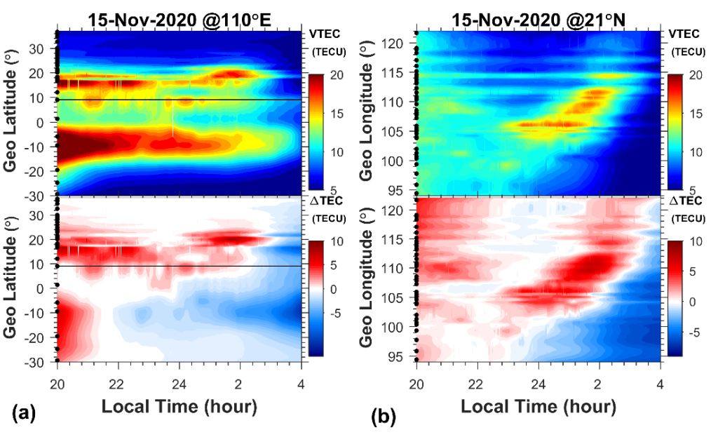 1 夜间增强事件期间沿110°E (a)和21°N(b)的绝对TEC变化图和相对TEC变化图