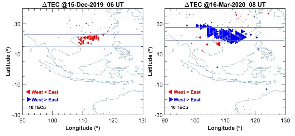 2 两次事件中的TEC梯度值分布图。三角形的大小表示经度梯度的大小,颜色表示经度梯度的方向,位置表示每个接收机所接收到的信号范围的中心点