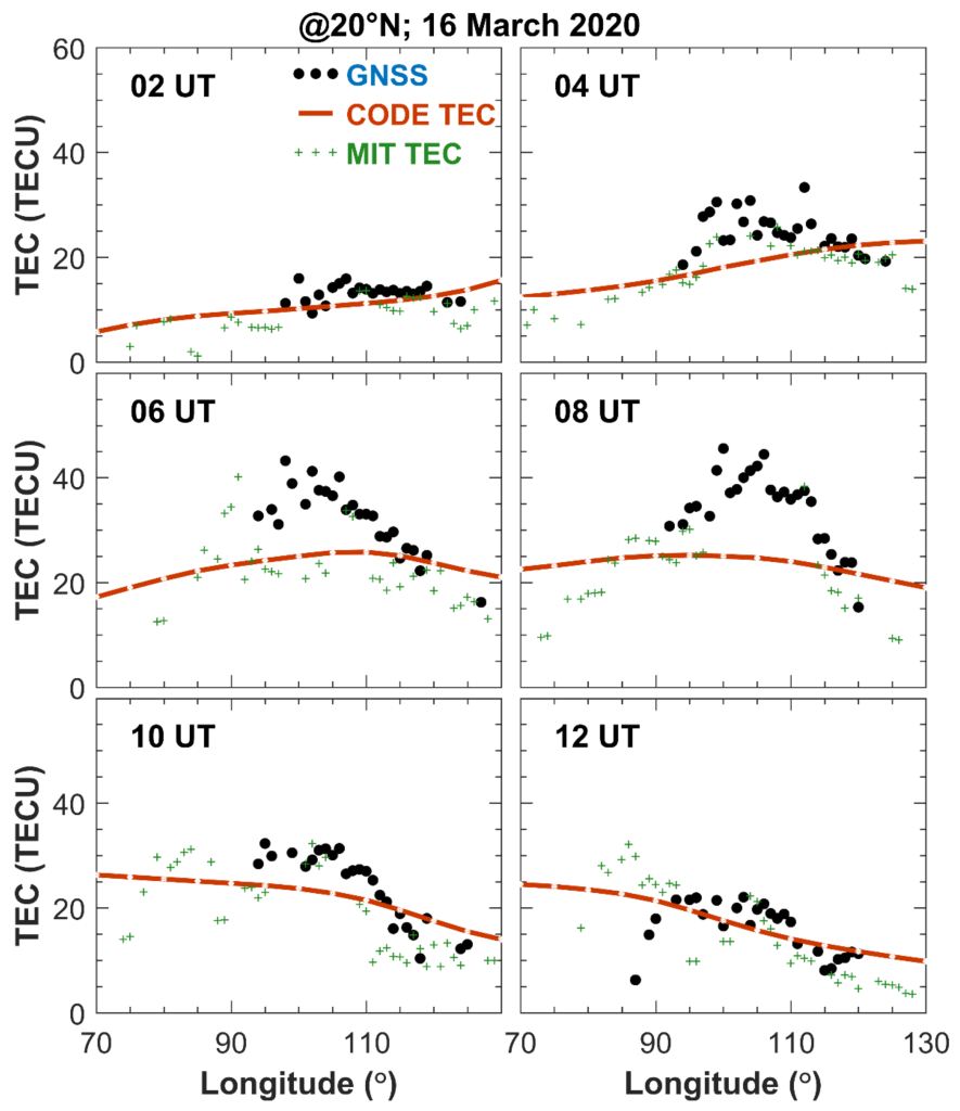 对比分析各机构发布的TEC产品,发现各机构的数据产品均无法呈现夜间增强的结构。多数机构的数据产品难以呈现这些显著的经度梯度结构(图3)。因此,需要提高时空分辨率来提升对电离层水平结构及其时间演变的描绘能力。