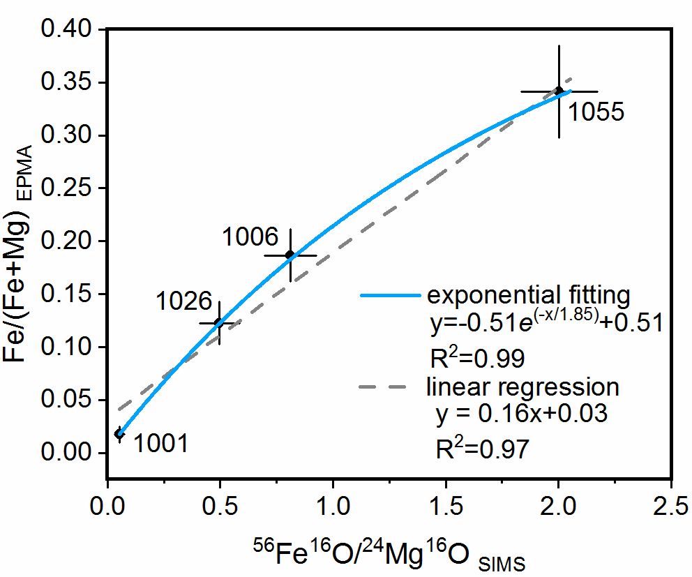 图1 白云石氧同位素标样的平均Fe/(Fe+Mg)值(EPMA)与平均56Fe16O/24Mg18O比值(SIMS)之间的相关性