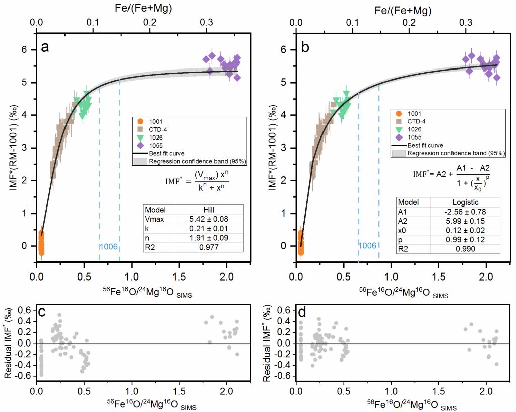 图2 SIMS在线测量数据Hill(a)和Logistic(b)方程拟合结果对比。IMF*(RM-1001)(‰)为仪器的测量偏差标准化(IMF)到1001标样的值。Hill(c)和Logistic(d)方程拟合的IMF*残差图