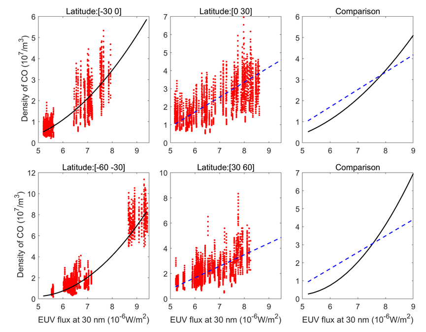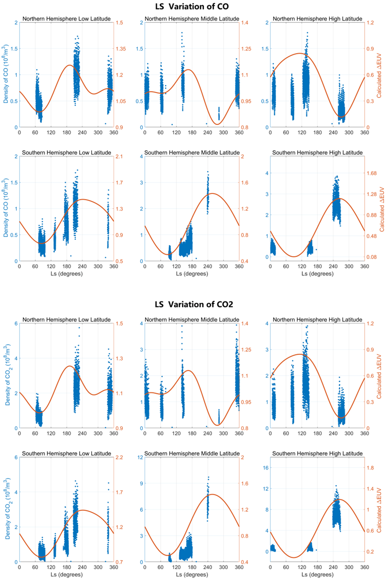 他们根据太阳天顶角及火星到太阳距离的计算,发现:太阳EUV通量的季节变化最强出现在南半球高纬度地区,最弱出现在北半球低纬度地区。COCO2密度具有相同的变化特征(图1)。观测和模拟计算均表明,南半球的季节变化比北半球更显著,因为火星到太阳的距离和太阳天顶角对太阳EUV通量的影响在南半球方向相同,但在北半球方向相反。