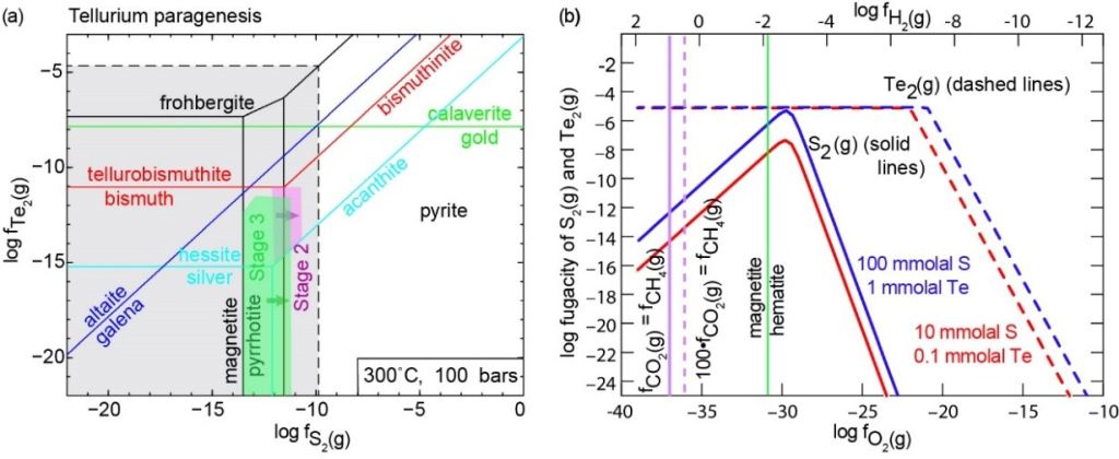 (1) 五龙主成矿阶段(Stage 2和3)发育大量铋矿物,其类型(达20种:自然铋、辉铋矿、Bi-碲化物、Bi-硫盐矿物、Bi-硫代碲化物、Bi-Au矿物相)和共生关系复杂,交代结构普遍。其中,Stage 2以发育富含Pb和Ag的Bi-硫盐矿物而与Stage 3相区别。辉碲铋矿族矿物和热力学计算表明,主成矿阶段均为还原流体体系且氧逸度变化不大(图2)。自Stage 2到Stage 3,铋矿物共生次序复杂变化是对流体成分(特别是Ag和Pb)波动、硫逸度降低的响应(图2和图3)。