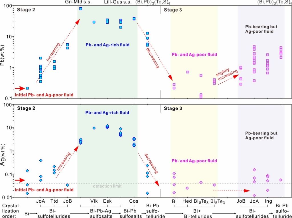 图3 五龙主成矿阶段随结晶顺序典型铋矿物的Ag和Pb含量变化及相应流体成分演化