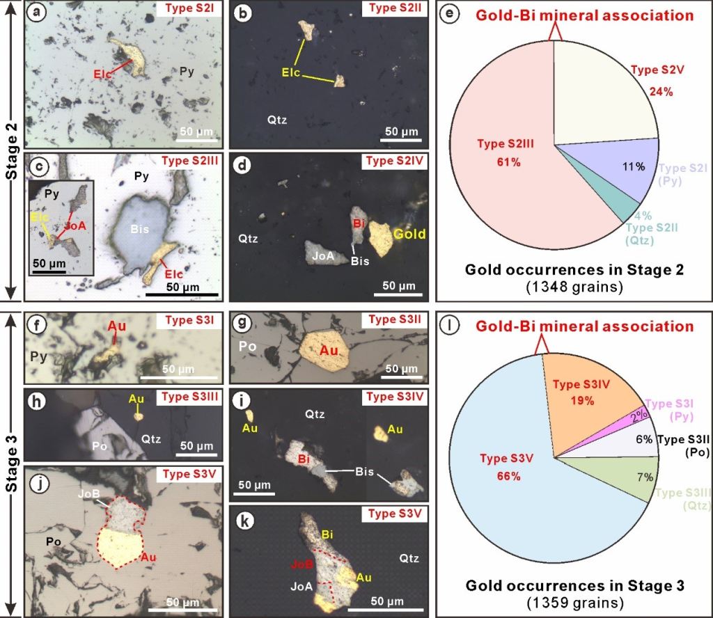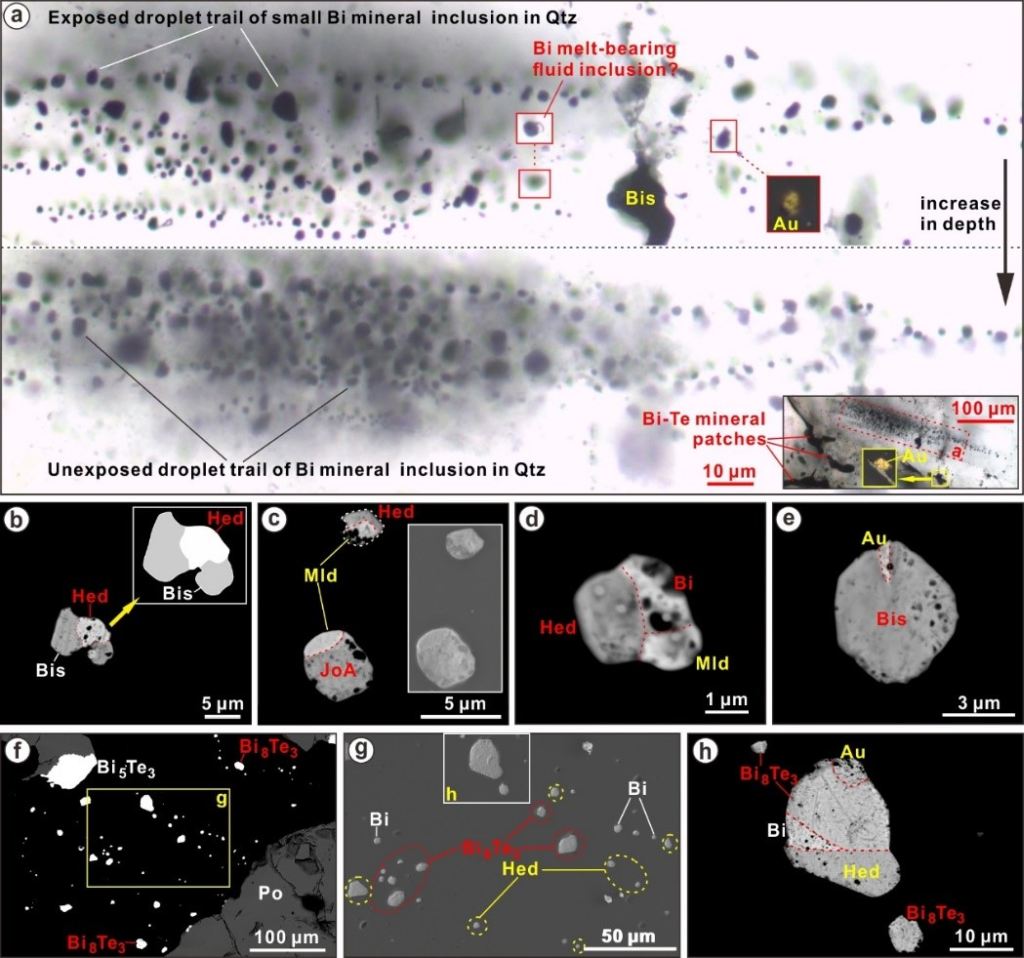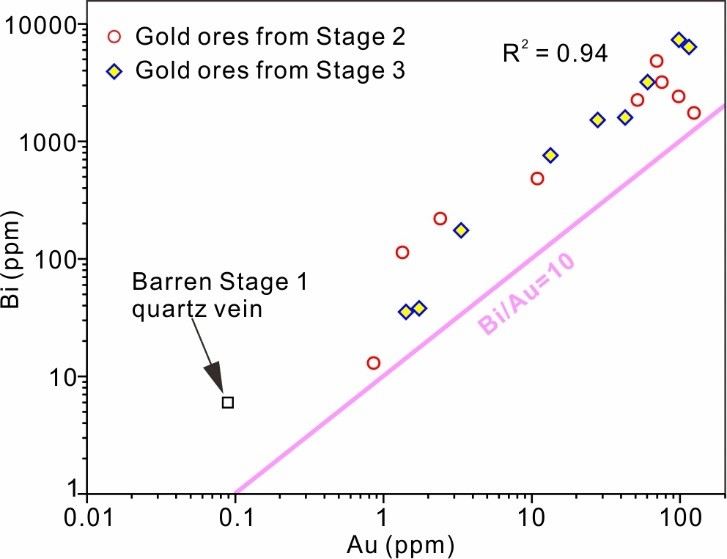 (2) 五龙金沉淀富集与富Bi熔体(Bi-rich melt)有关,为多阶段(Stage 2和3)富Bi-Au多金属熔体成矿。主要证据有:①主成矿阶段成矿温度(流体包裹体均一温度普遍>250°C)和还原流体环境利于富Bi熔体(最低熔点~235°C)形成(图1);②含金石英脉中发育大量呈线或面状分布的微滴状铋矿物包裹体(图4),其内可见金、黑铋金矿(Au2Bi)、硫铋金矿(AuBi5S4)等多种矿物相(图4b-图4e、图4h和图5c、图5j、图5k),直接指示有大量富Bi熔体从成矿流体中析出并吸纳流体中的Au形成了富Bi-Au多金属熔体;③含金石英脉显示出强Bi-Au亲和性(Bi-Au association),金矿石富Bi(>100–7332 ppm)且与Au呈强正相关(Bi/Au > 10;图6);岩相学观察与统计也表明,约85%的金粒与铋矿物有密切时空联系(图5)。