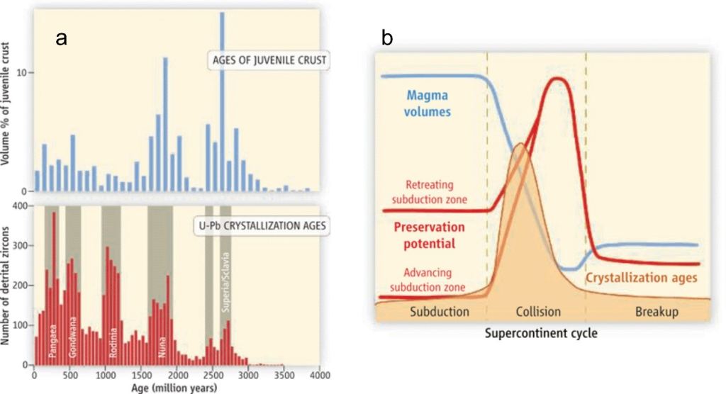 自板块构造运动启动以来,大陆地壳物质被认为主要通过俯冲相关的岩浆活动等方式产生,又通过俯冲侵蚀等方式被破坏。相关统计研究表明,目前全球大陆地壳的新生速率近似等于大陆地壳的破坏速率,意味着全球大陆地壳的净生长趋近于零(Clift et al., 2009)。但这种大陆地壳总量的收支平衡在地球历史中并非总被保持。大量研究显示,在不同的历史时期存在着一些大陆地壳净生长的高峰期,它们在时间上与超级大陆的形成时间有着良好的对应关系(图1a;Cawood et al., 2013;Kemp et al., 2006)。因此,大陆地壳的生长也常常被描述为一个幕式的过程。最近的研究表明大陆地壳的幕式生长过程可能是由于碰撞阶段大陆地壳物质的保存潜力更高,即大陆地壳破坏率更低所致(图1b;Hakesworth et al., 2009; Mulder and Cawood, 2022)。但是为何在大陆碰撞阶段地壳物质保存潜力会更高并没有得到解释。