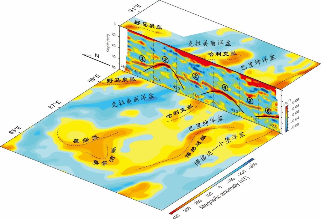 图2 东准噶尔地区地壳结构与地磁异常三维视图。正地磁异常标志着古生代岛弧的位置;莫霍面片段1、3、5代表着岛弧的莫霍面;莫霍面片段2、4、6代表着海洋盆地的莫霍;克拉美丽洋盆和巴里坤洋盆的莫霍面仍保留其在古生代向两侧岛弧下方俯冲的形态