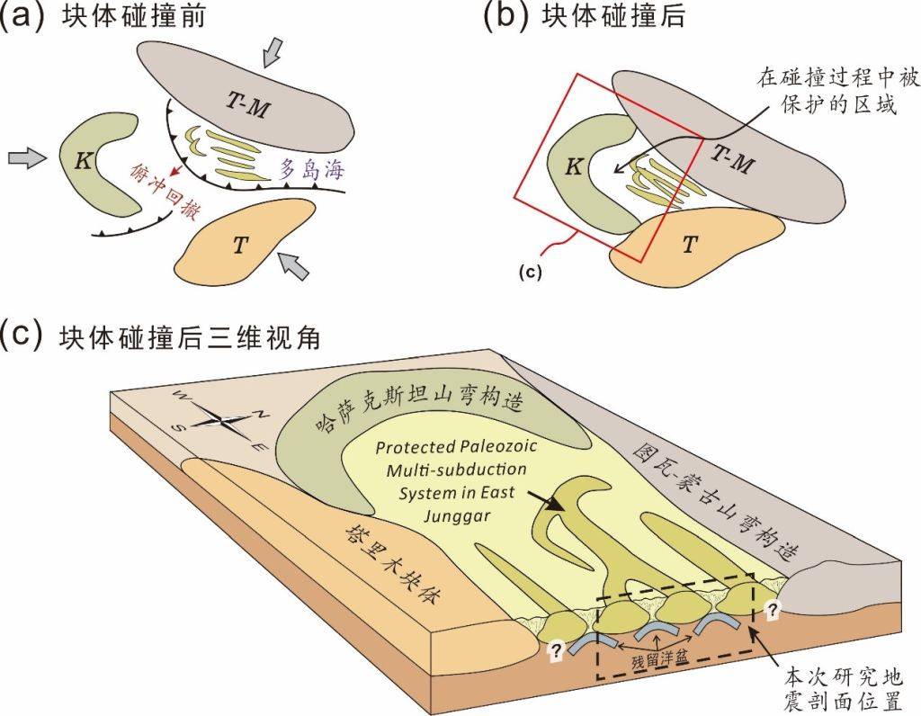 由于海洋盆地密度相对大陆地壳较大,因此洋盆通常被认为在块体拼合过程中会俯冲至地幔,难以作为新生大陆的一部分。但实际上发生拼合碰撞的块体边缘往往是不规则,这就会导致在拼合的时候块体之间存在一些空隙,为海洋盆地的保存提供了条件。在东准噶尔地区的块体拼合过程中,哈萨克斯坦山弯构造是一个马蹄形的构造单元,它吸收了与北部图瓦蒙古块体和南部塔里木块体碰撞过程中的主要应力,从而对其内部的多岛海系统起到了保护作用(图3)。因此,古生代的海洋盆地得以广泛的保存在准噶尔盆地内。近年来,在西准噶尔地区开展的综合地球物理工作也揭示了大量的残留洋盆的存在(Liu et al., 2019; Wu et al., 2018; Xu et al., 2020)。