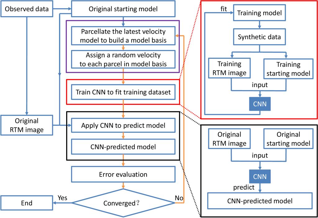800彩票油气资源研究院重点实验室吴毓朗博士后与合作导师王彦飞研究员,以及美国得克萨斯大学达拉斯分校George A. McMechan教授展开合作,提出一种自适应反馈机制下基于卷积神经网络(CNN)的高清晰反射波反演算法(CNN-RWI)。该算法既不需要拟合地震记录也不依赖广泛代表各种不同构造的速度模型库,而是通过自适应地聚类切割先验速度模型构建训练样本,利用不断改进的CNN,准确预测高清晰速度模型(包括浅层和深层的背景速度以及反射界面信息)。