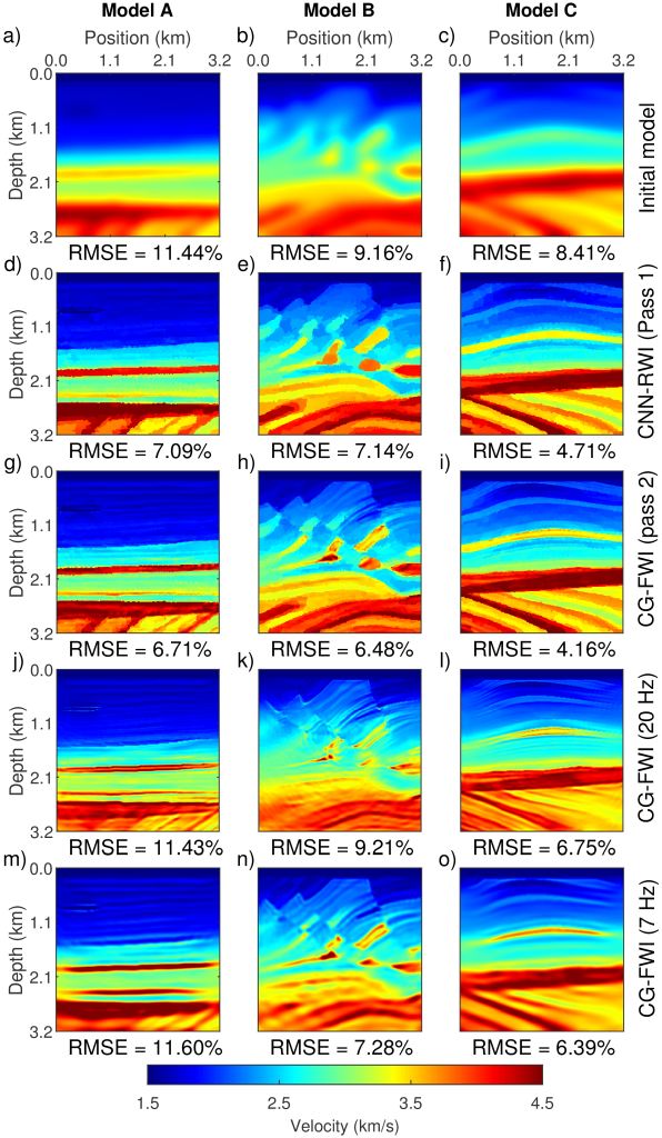 3 速度模型对比图。(a-c)与真实速度模型(图2中的模型ABC)相对应的初始速度模型;(d-f)基于初始速度模型所得到的CNN-RWI反演速度模型;(g-i)将CNN-RWI反演速度模型作为初始速度模型所得到的CG-FWI反演速度模型;(j-l)基于初始速度模型所得到的CG-FWI反演速度模型;(d-l)基于20Hz主频的震源得到的反演速度模型;(m-o)基于初始速度模型和基于7Hz主频的震源所得到的CG-FWI反演速度模型