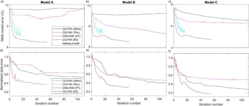 4 反演速度模型和地震记录误差对比图。(a-c)与图3中反演速度模型相对应的RMS模型误差曲线;(d-fa-c中的反演模型误差相对应的归一化的地震记录误差;左、中、右列分别对应图3中左、中、右列的反演模型结果
