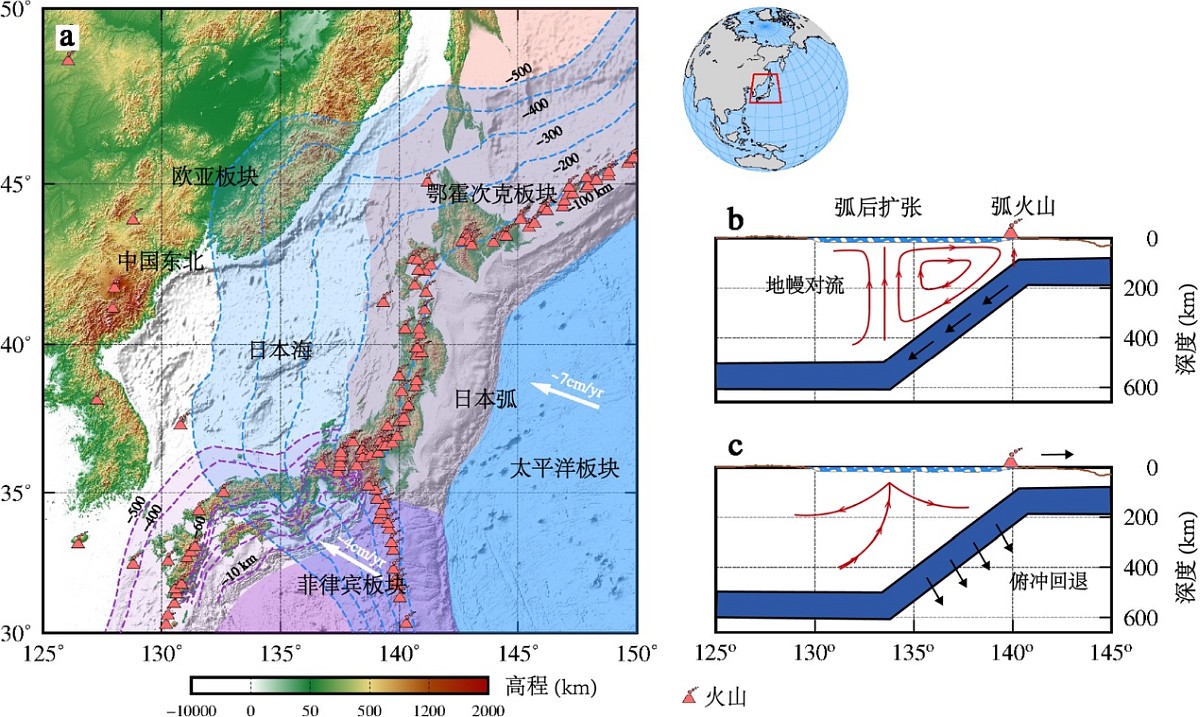 图1 日本海及周边地区地形图。(a) 日本海区域构造示意图。虚线表示太平洋和菲律宾板块俯冲深度等值线 (Hayes et al., 2012; Hirose et al., 2008; Wei et al., 2015)。(b-c) 为不同的边缘海张开机制,包括大洋岩石圈下插引起的地幔对流和俯冲回退产生的上升对流