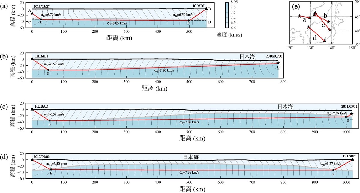 图2 Pn波射线追踪。(a-d) 作为例子给出四段Pn波射线。每幅图中包括基于CRUST 1.0 (Laske et al., 2013) 提取的二维速度模型,追踪初至P波获得的Pn射线路径 (红线)。波前等时线 (细黑线),间隔为2.5 s。α1s,α1r和α2分别为震源、台站和上地幔顶部附近的纵波速度。(e) 四段射线所对应的地震事件 (五角星)、台站 (三角形) 及沿大圆路径的射线分布图