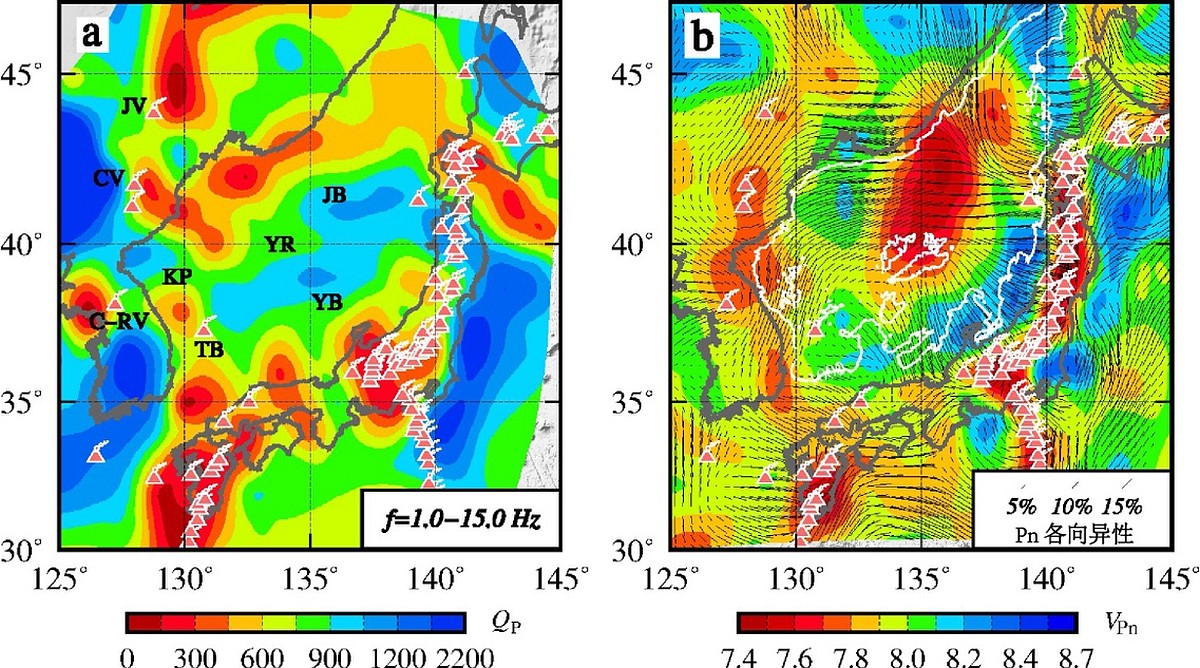 图3 (a) 本研究得到的日本海及周边地区宽频带Pn波衰减模型。 (b) Pn波速度模型及各向异性 (Lü et al., 2019)。JB=日本盆地;TB=对马盆地;YB=大和盆地;KP=朝鲜高原;YR=大和海山;JV=镜泊湖火山;CV=长白山火山;C-RV=中加良火山