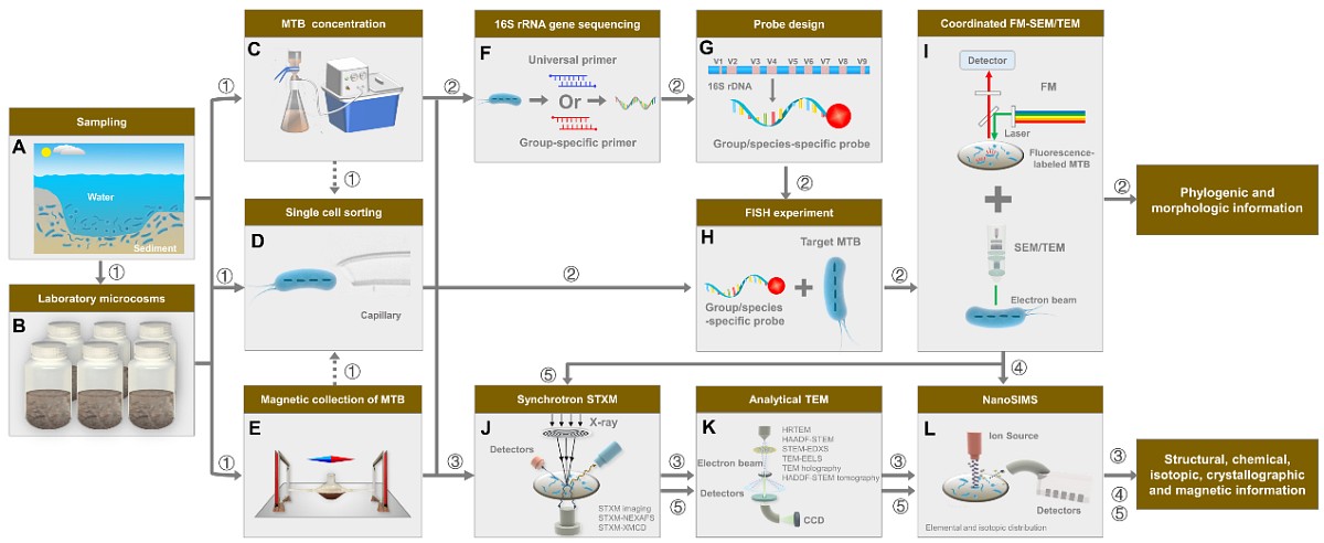 第③-⑤步:趋磁细菌单细胞水平综合显微学关联研究(J-L)。J. 同步辐射扫描透射X-射线显微镜对趋磁细菌细胞开展化学组成和磁学性质分析(纳米尺度)。K. 综合透射电镜对趋磁细菌和磁小体进行结构、形貌、磁性和化学成分分析(原子尺度)。L. 纳米二次离子质谱对趋磁细菌细胞进行化学元素和同位素分析(纳米尺度)。