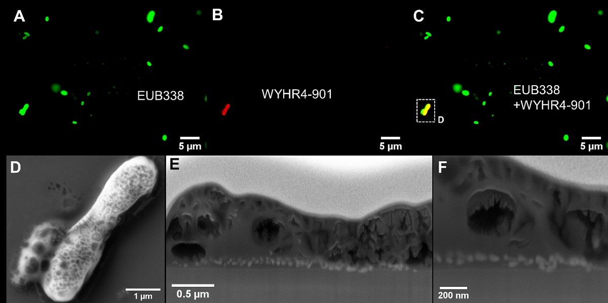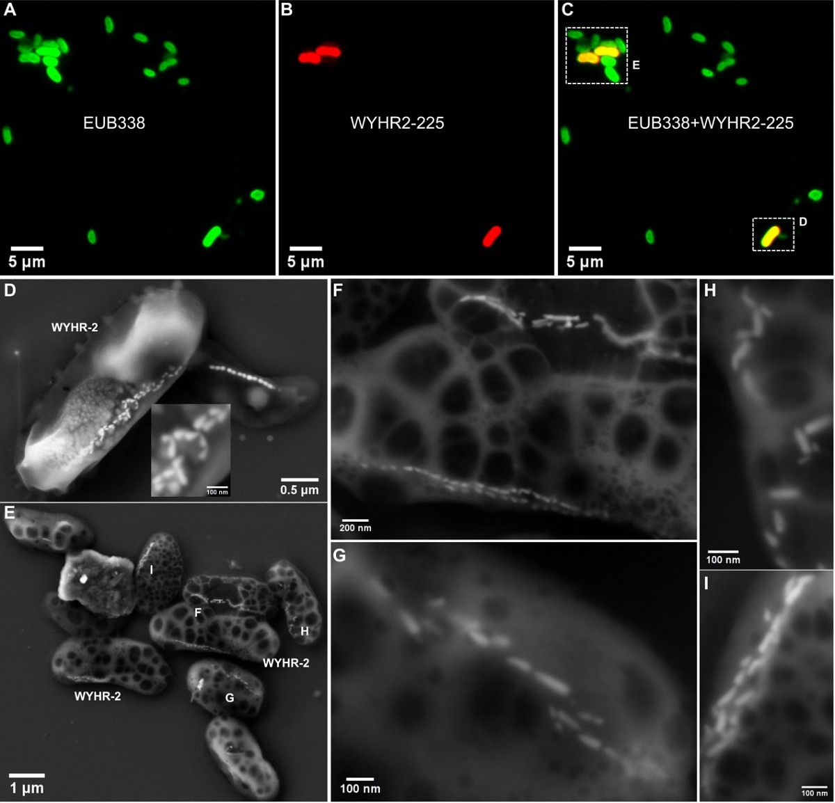 图2 趋磁细菌WYHR-2的FISH-SEM关联分析