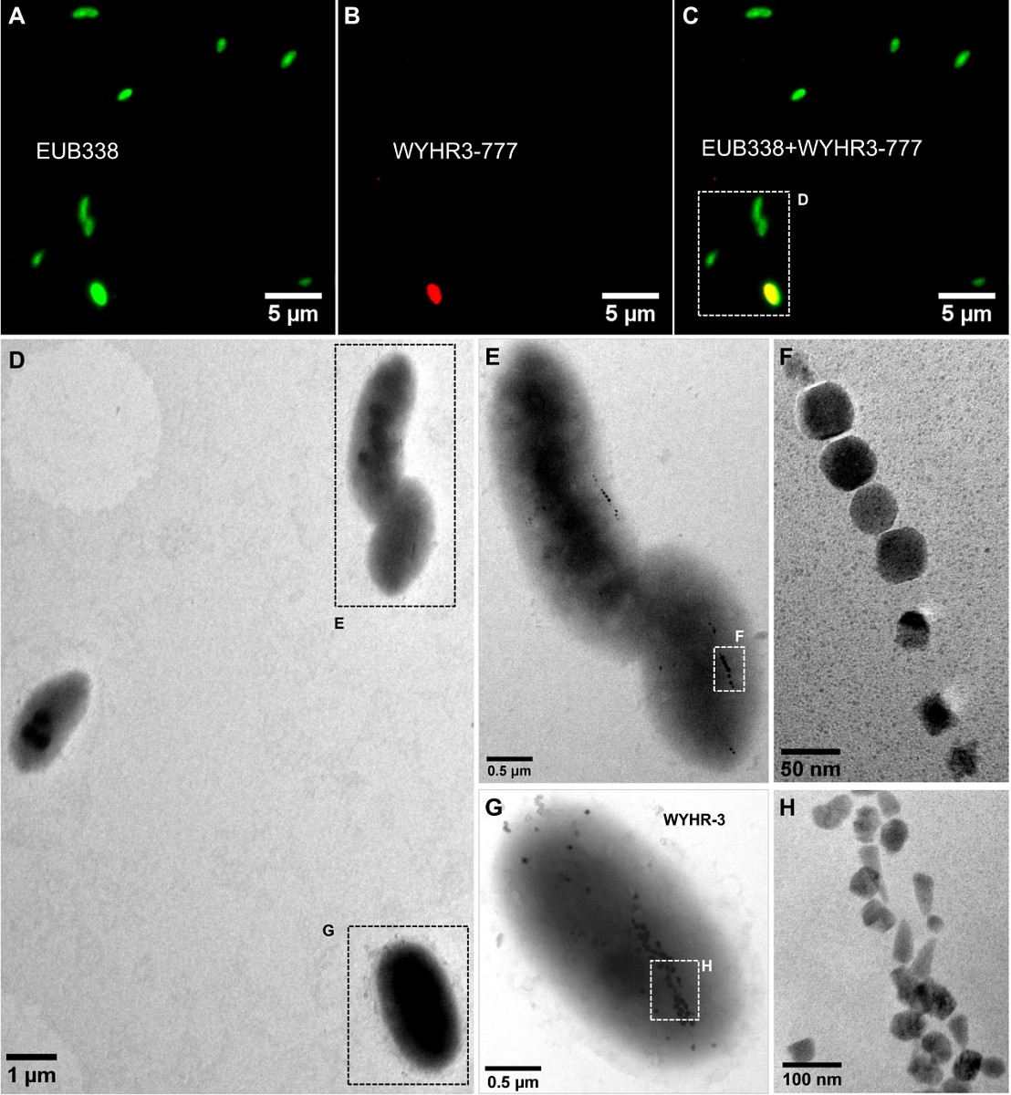图3 趋磁细菌WYHR-3的FISH-TEM关联分析。使用TEM是因为,WYHR-3细胞相对较大较厚, SEM不能获得相对清晰的磁小体图像