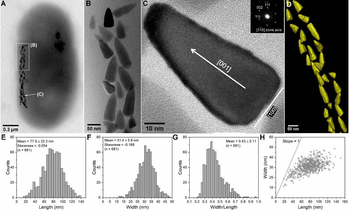 (2)荧光—透射电镜联用(FISH-TEM)鉴定WYHR-3(图3)。结果显示,WYHR-3除了合成 33 ± 13个平均长度为71.0 ± 18.7 nm,平均宽度为30.3 ± 4.9 nm (n = 846; 共分析31个细胞)的直子弹头形磁铁矿成分的磁小体外,还合成18 ± 11个平均长度53.7 ± 13.1 nm,平均宽度44.0 ± 9.7 nm的立方体或棱柱形胶黄铁矿成分的磁小体。