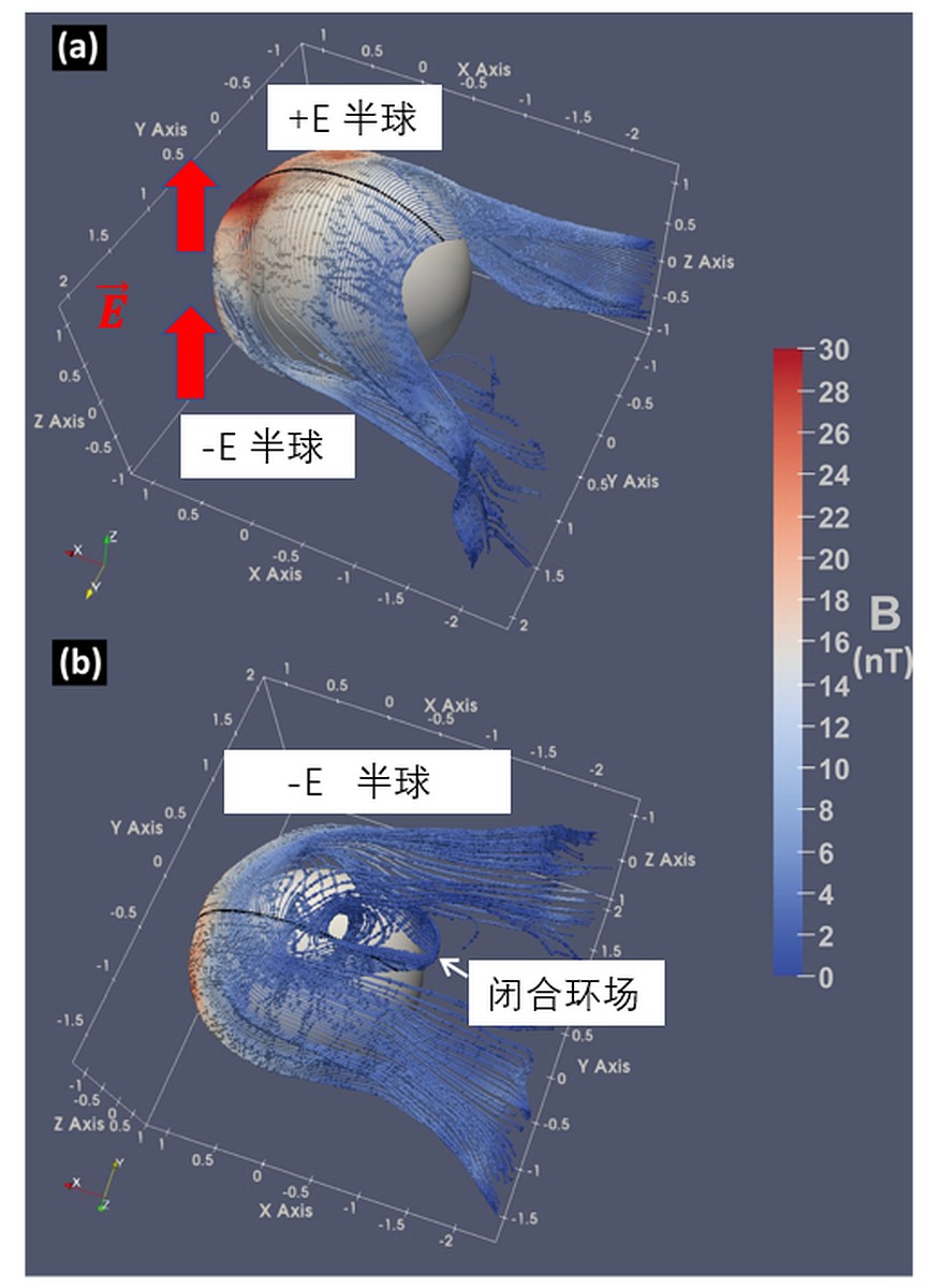他们的结果表明火星感应磁层磁场结构形态主要受行星际磁场方向控制。将磁场数据转到由行星际磁场方向控制的坐标系后,他们发现,在向阳面,受压缩的行星际磁力线 “披挂”在火星上游,并在磁鞘等离子体热压驱动下随等离子体流尾向运动,绕过极区进入夜侧,并向夜侧的磁赤道区域“沉降”,形成感应磁尾。但是与传统图像显著不同的是,磁场结构具有明显的半球不对称性——在太阳风电场从行星指向向外的半球(+E半球),磁场结构呈较为规则的垂挂结构,在太阳风电场指向行星的半球(-E),磁力线显著拉伸,并有向中心挤压的趋势,甚至在-E半球的极区上空形成“闭合环场”结构。
