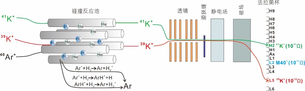 以Nu Sapphire为代表的最新一代含碰撞池CC-MC-ICP-MS,配有传统MC-ICP-MS的高能通道(6kV加速电压)和基于碰撞池技术的低能通道(4kV加速电压),其中六级杆碰撞反应池使用氢气和氦气,能够有效去除各种含氩基团对41K+、40Ca+和56Fe+等造成的干扰(图1),因此可以在低分辨模式下对K、Ca及Fe同位素开展高精度分析,可有效降低样品测试含量,有利于珍贵样品和低含量样品分析。800彩票成矿元素与同位素分析实验室于2021年4月安装了Nu Sapphire,实验室人员李文君、高炳宇、王静和苏本勋等通过系统优化新一代碰撞反应池(CC)-MC-ICP-MS(Nu Sapphire)的低能路径参数,使用低分辨+碰撞反应池技术,相继建立K、Ca及Fe同位素分析测试方法。