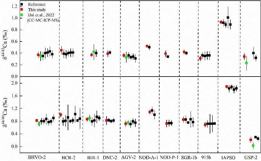 Ca同位素:实现了40Ca、42Ca和44Ca的同时测定,将Ca测试浓度降低至100 ng g-1,δ44/40Ca的长期精度与TIMS相似(2SD < 0.1‰);11种地质标样的Ca同位素分析结果与文献报导一致(图3);δ44/40Ca和δ44/42Ca的同时测定还可以获得放射性40Ca(ε40Ca),40Ca作为40K衰变子体之一,对高K样品进行ε40Ca分析在研究岩浆成因和风化作用中具有较大潜力。