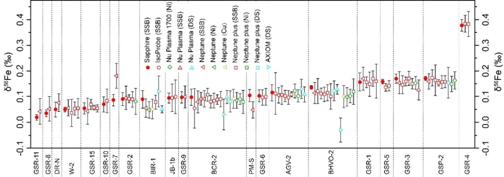 Fe同位素:将Fe上样量降低至50 ng,相对中、高分辨模式提高了~ 40倍,且δ56Fe的长期精度优于0.03‰(2SD);21种地质标样的Fe同位素分析结果与文献报导一致(图4)。