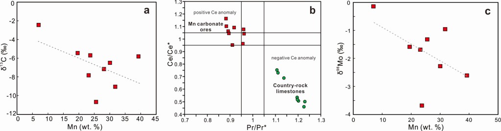 昭苏锰矿赋存于石炭系阿克沙克组海侵层序上部的泥质灰岩中,矿石矿物主要为锰碳酸盐(菱锰矿、锰方解石),次为硫锰矿(图1)。局部可见锰碳酸盐矿物呈核-边结构,核部为锰方解石,边部为菱锰矿(图1b),该结构一般认为是早期成岩阶段的产物。矿石中的有机质常被锰碳酸盐矿物交代(图1e),结合矿石明显偏负的碳同位素值(图2a),说明成岩过程中有机质分解产生的CO32-对碳酸锰矿物的形成具有重要的贡献。锰矿石的稀土元素经页岩标准化后,显示明显的Ce异常(图2b),另外锰矿石还具有偏负的Mo同位素值(图2c),这些特征与现代氧化水体中形成的锰结核一致。综合上述,认为昭苏碳酸锰矿石初始沉积自氧化水体,是锰氧化物与有机质发生成岩还原反应的产物,在此过程中继承了原始锰氧化物吸附的稀土元素及Mo同位素信号。