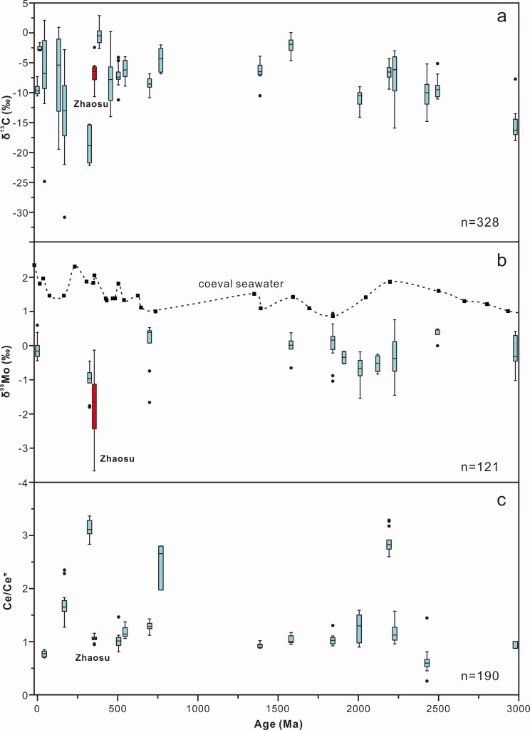 2 昭苏锰矿石Ce异常及C-Mo同位素特征