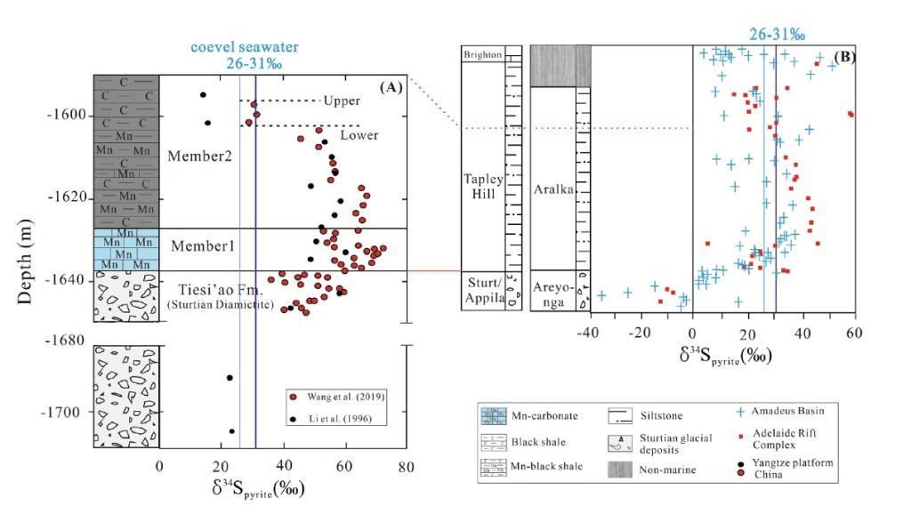 通常认为,这种黄铁矿形成于低硫酸盐环境,系雪球地球期间海-气缺乏交换、冰层下部海洋硫酸盐在缺氧环境下几乎被消耗殆尽所致。然后,这一解释与这时期各地沉积物高含黄铁矿相矛盾。有研究认为,可能是因为硫酸盐还原形成轻硫同位素(32S),选择性地并入有机质中。也有研究认为,雪球地球期间,冰雪可达1-2 km厚,冰雪消融一定产生了可观体积的淡水,分布在陆地、海洋近岸,覆盖在远洋海水的表层。考虑到Rodinia大陆裂解作用可能形成众多凹陷、当时海平面较低这些特点,理应在海洋近岸或陆地形成众多的淡水湖泊。然而,迄今未有这时期淡水沉积的报道。相反,已经发现,北冰洋130-60 kyr冰期-间冰时期、黑海、波罗的海、印度尼西亚Kau海湾、委内瑞拉Cariaco盆地末次冰期后均发育淡水沉积物。有意思的是,这些淡水沉积物同样发育超重黄铁矿。而伴生的锰矿床中锰的来源和形成机理,也存在多种认识:来自热液流体或大陆风化,形成于氧化锰的成岩转化,或从缺氧的水柱中直接沉积下来。